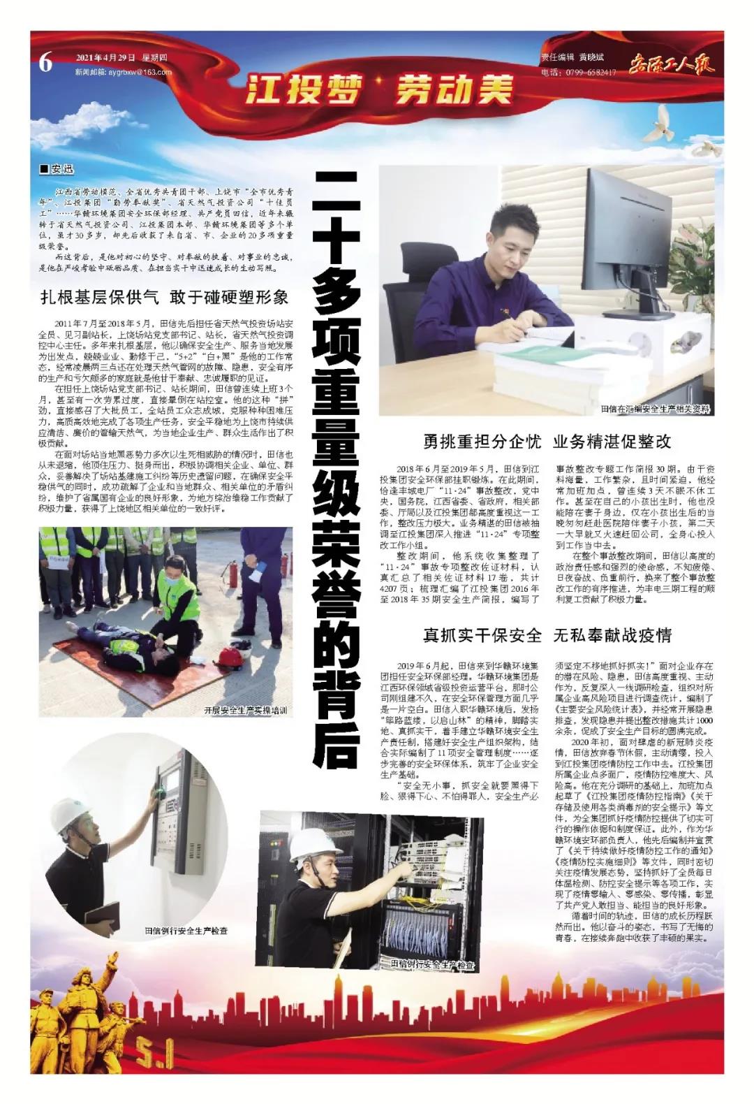 江西省劳动模范、全省优秀共青团干部、上饶市“全市优秀青年”、江投集团“勤劳奉献奖”、省天然气投资公司“十佳员工”……华赣环境集团安全环保部经理、共产党员田信,近年来辗转于省天然气投资公司、江投集团本部、华赣环境集团等多个单位,虽才30多岁,却先后收获了来自省、市、企业的20多项重量级荣誉。