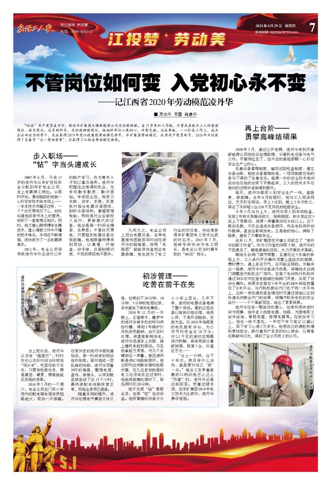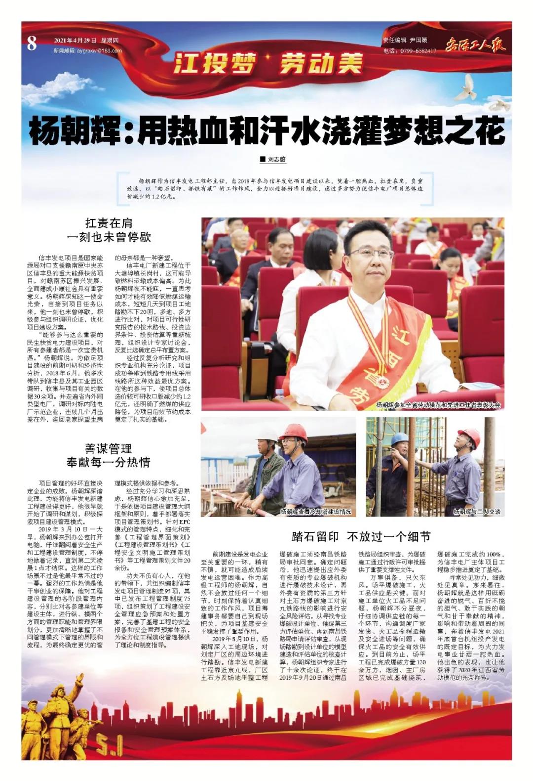 鲜花因汗水而绽放,事业因奋斗而勃兴。安源工人报推出“江投梦 劳动美”特刊,刊载江投集团26名全国、全省及集团劳动模范的典型事迹,为劳动喝彩,向劳模致敬!