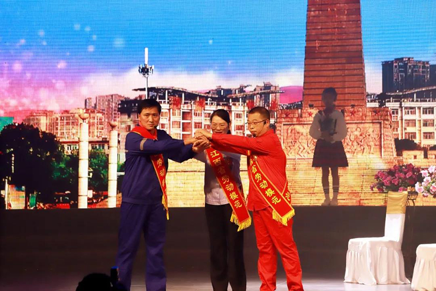 演出前,集团党委书记、董事长揭小健,党委副书记、副董事长、总经理曾昭和分别与全国劳模、省劳模、省五一劳动奖章代表握手留念。14:40,身披绶带的劳模代表走进剧场,全场观众全体起立,热烈鼓掌欢迎,给予劳模最高的礼遇和尊重。