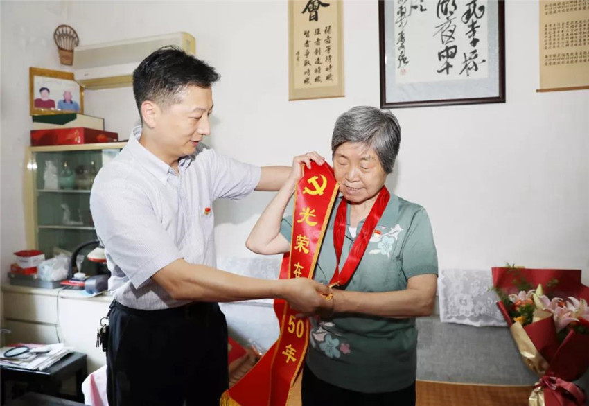 杨杰抚摸着金灿灿的纪念章说道,”今天受领‘光荣在党50年’纪念章,我心情无比激动,这是党给予我的最高荣誉,我打心里感恩党中央对我们老同志的关心关怀。”